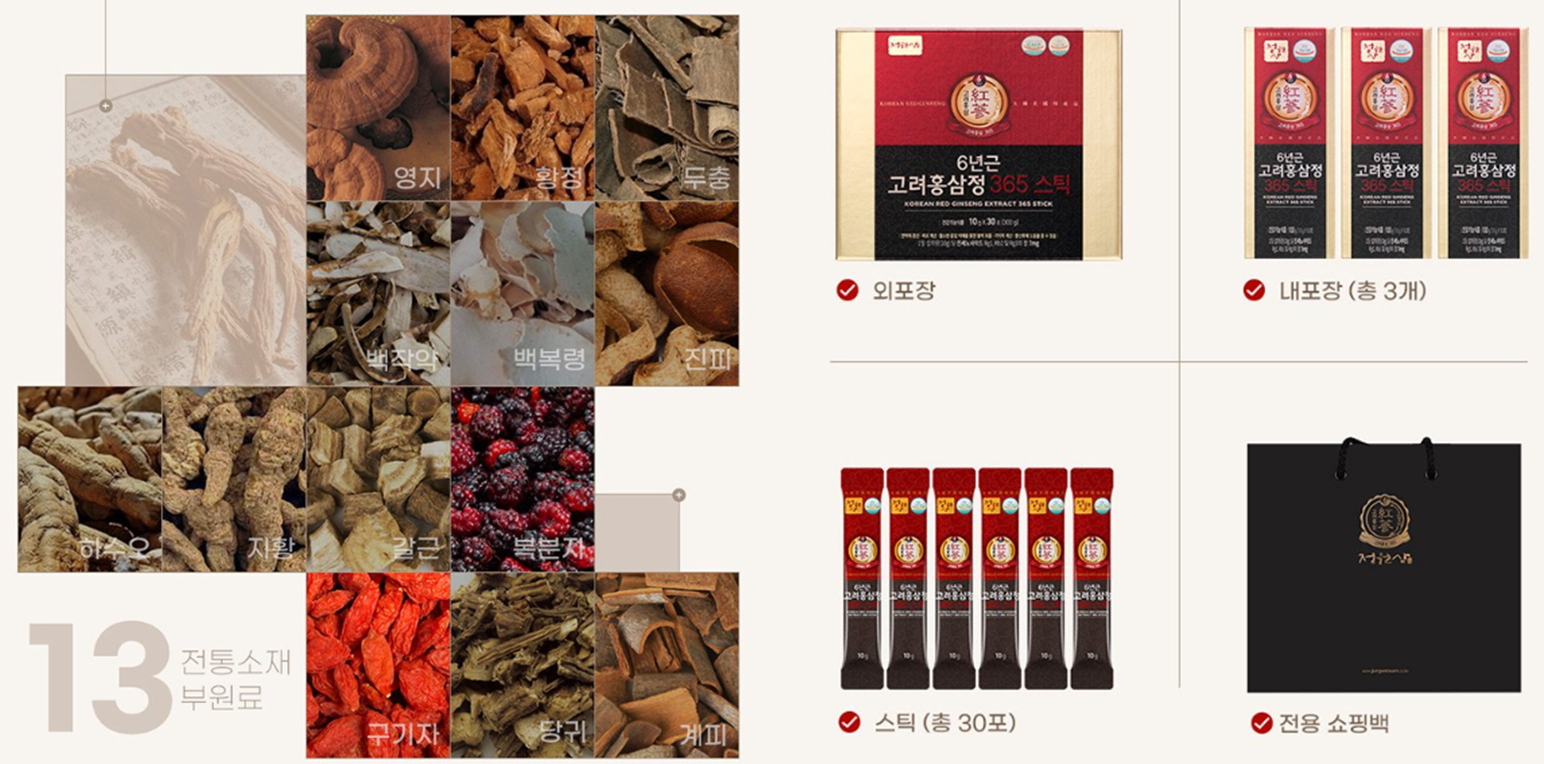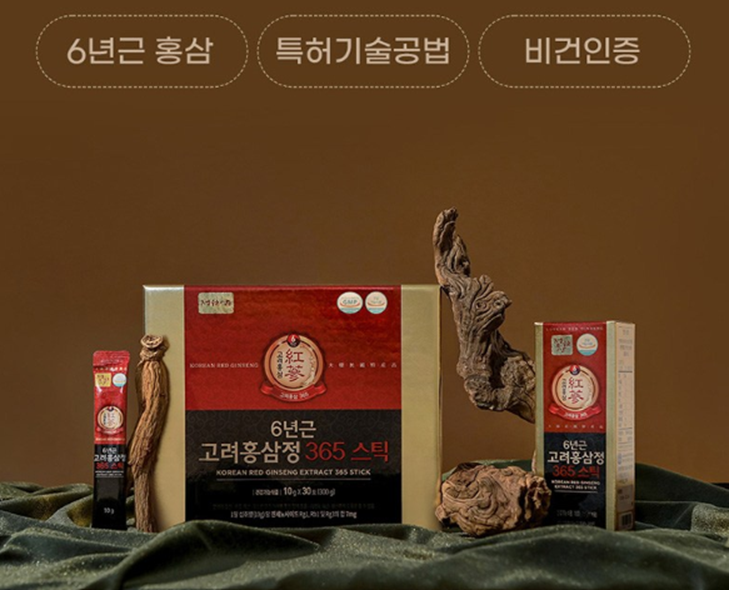 현재 30%의 할인을 진행 중이며 6년근 고려홍삼정 365스틱 30포로 구성 되어 있습니다.